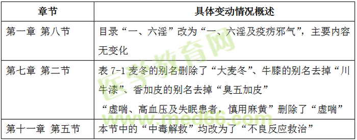 《中藥學(xué)綜合知識與技能》教材沒有較大變動,只是個(gè)別地方有小調(diào)整,具體變化情況如下: