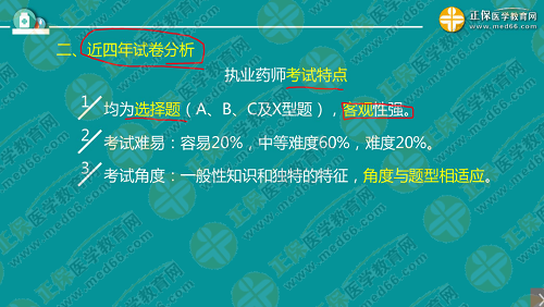 執(zhí)業(yè)藥師考試特點(diǎn):(1)客觀性強(qiáng);(2)考試難易程度:容易20%,中等60%,難20%?。?)考試角度:角度與題型相適應(yīng)。
