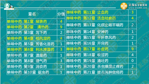 總結(jié):由下表我們可以看出,單味中藥的部分:考點(diǎn)比較分散,考試的時(shí)候每章都有涉及!而中成藥部分:第一章的占比非常大,具體如下,應(yīng)引起大家的注意!