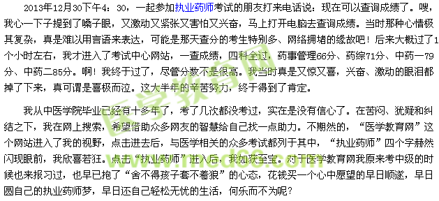 編者按:在2013年我的醫(yī)考之路大型征文活動(dòng)中,醫(yī)學(xué)教育網(wǎng)學(xué)員積極參與,為我們帶來(lái)了很多精彩的文章,網(wǎng)校執(zhí)業(yè)藥師考試學(xué)員(學(xué)員代碼:11475***)根據(jù)自己參加2013執(zhí)業(yè)藥師考試的經(jīng)歷寫(xiě)了這篇:《上醫(yī)學(xué)教育網(wǎng)很正確》,讓我們一起來(lái)見(jiàn)證她的醫(yī)考之路吧?