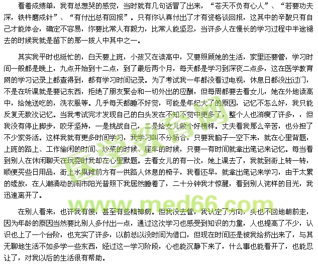 3月份決定了就開始了,首先很重要的是聽別人介紹報(bào)了醫(yī)學(xué)教育網(wǎng)的精品班,也買了教材。書也買了,班也報(bào)了,剩下的就開紿一頭扎進(jìn)去認(rèn)真、系統(tǒng)地學(xué)習(xí)。接著還有個(gè)計(jì)劃,那就是先主要學(xué)習(xí)三門課程,如果有時(shí)間把剩下的一門也學(xué)了,如時(shí)間不夠,明年再學(xué)。但要前三門要扎實(shí),就像老師說的那樣如果都想要結(jié)果什么也得不到。我擬定3、4、5月學(xué)習(xí)法規(guī)、綜合和藥一;6、7、8月再復(fù)習(xí)一遍這三門,9月學(xué)習(xí)藥二,10月最后總復(fù)習(xí)。計(jì)劃擬定了,我就開紿了,三個(gè)月過去了,我卻只聽完了二門課的基礎(chǔ)課,法規(guī)知識(shí)很枯燥無昧,無數(shù)次在聽課過過程中我就睡著了。當(dāng)再次睜開眼睛時(shí),只有老師還在那里恣恣不倦地講著,老師要是看得見,一定要用書敲我了,我覺得自己不記,光聽老師講也不行,于是我就開始做筆記,把老師講的很重要的知識(shí)點(diǎn)全部標(biāo)記下來并用筆記本抄下來,自己示不聽課時(shí),就拿出來記憶,才算有點(diǎn)眉目,才能去做練習(xí)題。到了學(xué)習(xí)藥綜上就有些費(fèi)勁了,它的知識(shí)點(diǎn)很細(xì),要記憶的東西很多,還好張老師把要記憶的在課堂上反復(fù)強(qiáng)調(diào)重復(fù),還編成了口訣,便于記憶,有些在課堂上就能記住。但確實(shí)又多又雜,不得不另外抽時(shí)間下苦功夫記憶。到了藥一那里,一位年輕又帥氣的湯老師的講課吸引了我,他的講課幽默生動(dòng),他確實(shí)從考生的立場出發(fā),為了方便考生記憶,還編了許多口訣、順口溜,小段子,還有把自己的故事也打成比喻,使枯燥無味的記憶一下子變得活躍起來,還增添了許多興趣,還有他自制的表格講義,綜合性很強(qiáng),直接就是題干和選項(xiàng)的形式,一目了然,把知識(shí)點(diǎn)一下濃縮了不少,聽課也不打瞌睡了,也輕松了許多。到了藥分那就不那么容易了,不知道是自己的化學(xué)基礎(chǔ)太差還是怎么的,聽了好多遍都無法理解,,聽課又始打瞌睡了,最后只有死記了。四個(gè)月過去了,前三門算是聽完了基礎(chǔ)課,也做了習(xí)題,可正確率總在家50%左右,下面的三個(gè)月(7、8、9)就是聽刺課,再鞏固一遍。誰知曉那些學(xué)過了的知識(shí)因?yàn)橹虚g有間隔,再次學(xué)習(xí)起來居然也忘得差不多了,只好又認(rèn)認(rèn)真真的再過了一遍,再來做練習(xí)題正確率達(dá)到了80%左右。把那些不懂的知識(shí)放到了答疑板上提問,有老師專門做答,這樣印象就更深刻了。九月中旬模擬試題就出來了,我藥二還真沒時(shí)間看了,就索性不看了。通過六套模擬試題反復(fù)做,沖刺課反復(fù)聽,重點(diǎn)章節(jié)反復(fù)記憶。也覺得是時(shí)候檢驗(yàn)我的時(shí)候了,考試終于在期盼中來到了,看著浩浩蕩蕩的考試大軍,覺得原來有這么多考生跟自己一樣付出過。我用很沉著冷靜的心態(tài)做完了四科考試科目,藥二有很多不會(huì)做,因?yàn)樽约壕透緵]學(xué),但我還是一題不拉地做完了,只是為了感受一下考試的難易程度??纪曛缶褪嵌€(gè)月的漫長等待,十二月底成績終于出了,35分,要是抽些時(shí)間學(xué)一下,說不好四門都及格了,雖說有些遺憾,但我也很知足了。