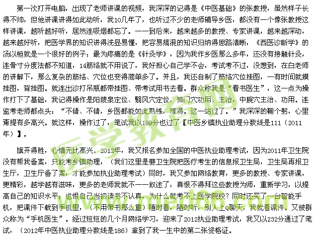 今年,新來的院長得知我的情況,特地把我調(diào)到衛(wèi)生院,我高興地接受了,因?yàn)榫臀乙粋€(gè)鄉(xiāng)醫(yī)第一考到了全國的資格證。(本鎮(zhèn)范圍)雖然工資不高,但也是我的成功之舉。我所取得的成功,全靠醫(yī)學(xué)教育網(wǎng)的輔導(dǎo),我真心的感受“網(wǎng)校自有顏如玉,網(wǎng)校自有黃金屋。”真心祝愿網(wǎng)校越辦越好。同時(shí)也為我5年后參加執(zhí)業(yè)考試奠定基礎(chǔ)。謝謝網(wǎng)校,謝謝網(wǎng)校所有的教授、專家。