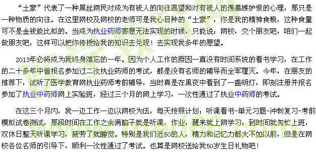 考試已過去三個月了,各位老師的風(fēng)采現(xiàn)在還歷歷在目,吳教授傳授中藥理論的功底、講課時思路清晰、條理性強(qiáng)、高雅!祝云鵬老師在傳授《藥事管理與法規(guī)》GLP時把L比喻小老鼠的尾巴形象解釋《藥物非臨床研究質(zhì)量管理規(guī)范》,非常貼近生活,輕松幽默,使人聽后永不忘記。通過聽錢韻文老師講課,很多內(nèi)容繁雜的東西一下子就簡單了,一本厚厚的書就變得薄了很多。閆老師授課語言通俗幽默,“那么~~”口頭禪至今還在耳邊回響。各位老師細(xì)致分析執(zhí)業(yè)藥師考試的重點、難點、考點,采用多種方式、方法幫助我加強(qiáng)記憶,使我一舉成功。