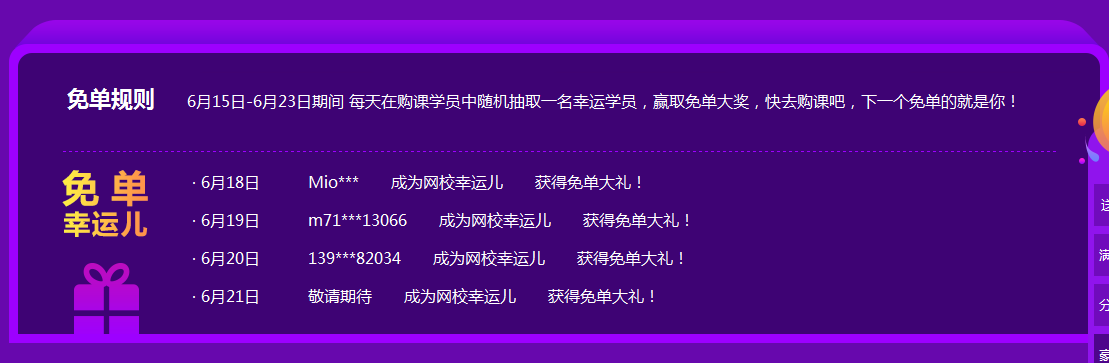 活動(dòng)期間每天在購(gòu)課學(xué)員中隨機(jī)抽取一名幸運(yùn)學(xué)員贏取免單大獎(jiǎng),心動(dòng)就快來吧!