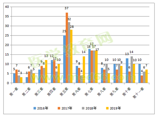通過對試題的梳理,分析近四年試題各章節(jié)分值比,發(fā)現(xiàn)今年《藥事管理與法規(guī)》分值分布情況稍有變動,其中第五章和第十章分值下降了4分,第八章分值下降了5分;而第六章,分值增加了10分,第三章和第四章均增加了4分。對于中藥的管理考察有所加強,其他重點章節(jié)變化不是很大,第五章為重中之重,對于處方、處方藥、非處方藥的考查依然是重點。