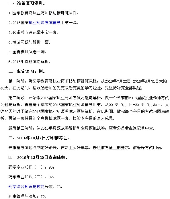 我準備一個筆記本,堅持在每一天復習結束的時候,把每天復習的章節(jié)記下來(只記章節(jié)提綱目錄,每天三五分鐘就記錄完了,我堅持到最后)。在復習中,我也有很多困惑。在聽完第一階段醫(yī)學教育網(wǎng)執(zhí)業(yè)藥師移動精講班課程以后,做了一套全真模擬試卷一套。四個科目有兩三個科目分數(shù)低于72分,心里有點不舒服,但是總的復習時間有限,我趕緊進入第二個階段的復習。一個月后,做完做完2016國家執(zhí)業(yè)藥師考試習題與解析以后,模擬測試也不理想。相比較跟一個月前測試差不多,我堅持不在這個問題上糾結,快速的進入第三階段的復習。最后,我收獲了成功的喜悅。在此僅以個人的一點心得體會,愿能夠給諸君一點幫助。