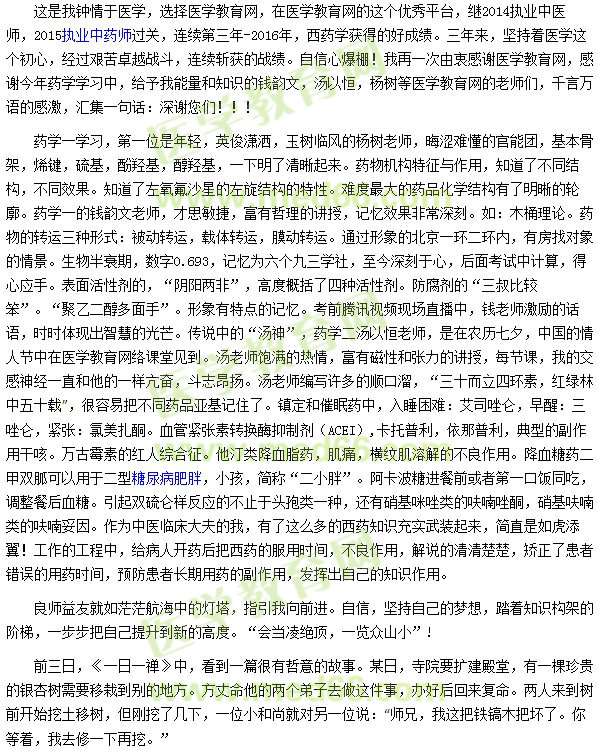 從開(kāi)始的茫然不知所措,醫(yī)藥化學(xué)一點(diǎn)基礎(chǔ)都沒(méi)有,心里一點(diǎn)底氣也沒(méi)有。有了醫(yī)學(xué)教育網(wǎng),這個(gè)良師益友。以簡(jiǎn)馭繁,提綱挈領(lǐng)。一下把課程猶如樹(shù)干、樹(shù)枝、枝葉,清晰直觀梳理出來(lái)。頓時(shí)有“獨(dú)上高樓 ,望斷天涯路的感覺(jué)” ,頓時(shí)豁然開(kāi)朗,自信心十足。緊接著,是艱苦卓越的學(xué)習(xí)時(shí)間,為了夢(mèng)中的情人“伊”,衣帶漸寬人不悔。披星戴月,利用工作之外一切業(yè)余時(shí)間,夏練三伏,揮灑汗水。一次次夢(mèng)里都是在學(xué)習(xí)、做題。日常工作中,每當(dāng)把學(xué)習(xí)的知識(shí)運(yùn)用到實(shí)踐中,深入淺出,行知合一。給患者以滿意的專業(yè)服務(wù)。頓時(shí)感悟到知識(shí)的價(jià)值,體會(huì)到知識(shí)就是要運(yùn)用到實(shí)踐中,回歸社會(huì),返璞歸真。“眾里尋他千百度,驀然回首,那人卻在燈火闌珊處”。