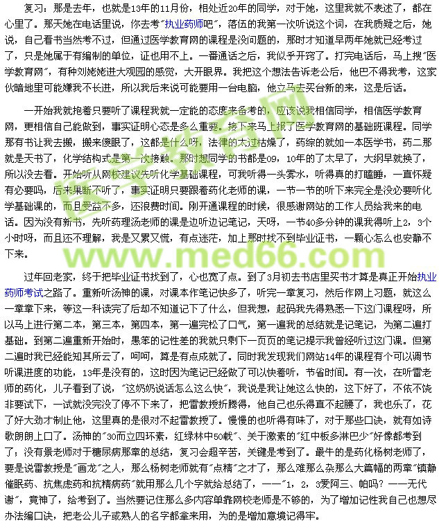 編者按:2014我的執(zhí)業(yè)藥師之路征文活動(dòng)開始后,受到了廣大學(xué)員的積極響應(yīng),學(xué)員的征文“我的執(zhí)業(yè)藥師之路——我這一年”在此次征文比賽中獲得了優(yōu)秀獎(jiǎng),網(wǎng)校向同學(xué)表示衷心的祝賀,并希望他的執(zhí)業(yè)藥師考試經(jīng)驗(yàn)可以幫助廣大考生備戰(zhàn)2015年執(zhí)業(yè)藥師考試,請(qǐng)大家一起欣賞。