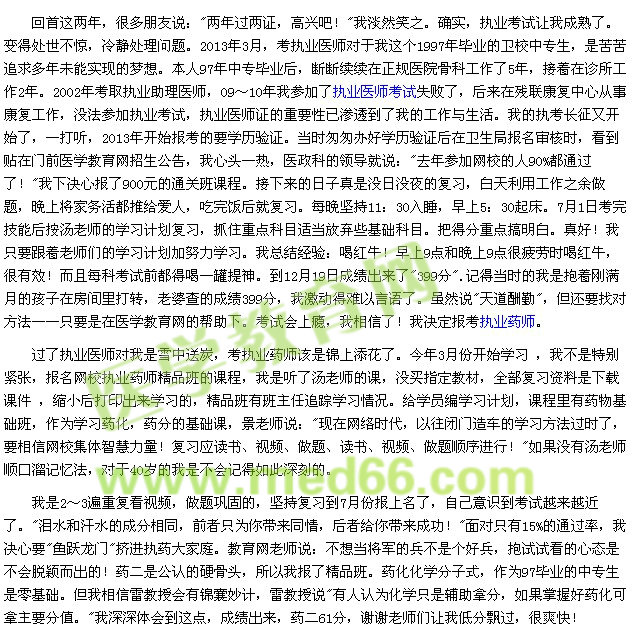 2014年12月29日早上7:00,我如往常一樣打開電腦QQ.閃爍著和我一起參加執(zhí)考的兩位朋友的頭像,我心一愣,"這我么早找我會有什么事呢?該不會是考試成績出來了吧?"心里頓時感到既興奮又害怕,因我這幾天都在關注這件事——分數(shù)。我急忙打開他倆的信息:"藥師成績出來了,我順利通過啦!感謝醫(yī)學教育網".此時的我如同孩子般快步的跑回房間,推醒熟睡中的愛人,請她起床幫我查成績!因為去年考執(zhí)業(yè)醫(yī)師的成績也是她幫查的,我害怕到不敢自己查。她也很緊張,愛人在我考試的這兩年實在付出太多了。"藥學專業(yè)一77分,藥學專業(yè)二61分,藥綜75分,法規(guī)76分,"過啦,過啦!她高興地讀到,我喜極而泣,但很快冷靜下來,藥二61分能否通過呢?分數(shù)線尚未公布呢,直到公布分數(shù)線為60分,我心中的大石頭才拿開。