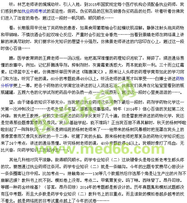 醫(yī)考路上十八載,今朝一日鑄輝煌。從1996年開始參加執(zhí)業(yè)護(hù)士考試開始,到2014年趟過執(zhí)業(yè)藥師這條河,歷經(jīng)十八年考取各種證書中,執(zhí)業(yè)藥師證是最難的。我是一名臨床執(zhí)業(yè)醫(yī)師,我把基層普通醫(yī)療衛(wèi)生工作看的無比神圣,考下執(zhí)業(yè)藥師證,能為廣大人民群眾提供更好的醫(yī)療服務(wù)……我深深懂得:用藥如用兵。任醫(yī)如任將。我今生的理想:不為良相,但為良醫(yī)……