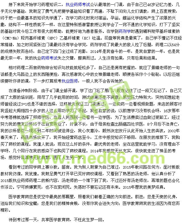 2014年元月初,一次同朋友聊天時,偶然談到報考執(zhí)業(yè)藥師,她說她2013年過了三門課,剩下一門藥理二,而且只差一分。我聽他說完,當時我馬上來勁了,興奮不已問這問那,繼而又跟她借來教材,把教材預(yù)習(xí)了一遍又打開醫(yī)學(xué)教育網(wǎng)試聽了幾段視頻。以前認為報考執(zhí)業(yè)藥師根本不可能,現(xiàn)在改變了思路,思路決定出路。在我的人生中我做了一個重大的決策,我李耀軍2014年也決定報考執(zhí)業(yè)藥師,聽到此話第一個反對的人是我的妻子她說:我沒有聽錯吧。有朋友開玩笑說:你是誰呀,就你也想考執(zhí)業(yè)藥師。加上今年女兒要考研兒子高考,老爸就給你們做個榜樣吧,我說我一定考個執(zhí)業(yè)藥師證,讓大伙瞧瞧,圓我人生的一個夢想。