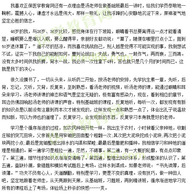 在此我非常想給后面志力于考執(zhí)業(yè)藥師的學(xué)員們一點建議:好的老師和自身的努力等于成功,堅定不移地選擇正保醫(yī)學(xué)教育網(wǎng)吧!