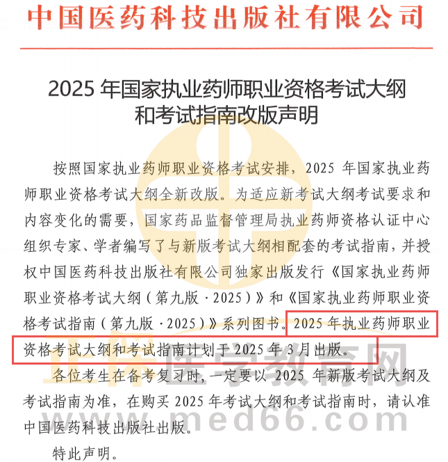 中國醫(yī)藥科技出版社發(fā)布了一則《2025年國家執(zhí)業(yè)藥師職業(yè)資格考試大綱和考試指南改版聲明》,其中明確:2025年執(zhí)業(yè)藥師職業(yè)資格考試大綱和考試指南計劃于2025年3月出版!