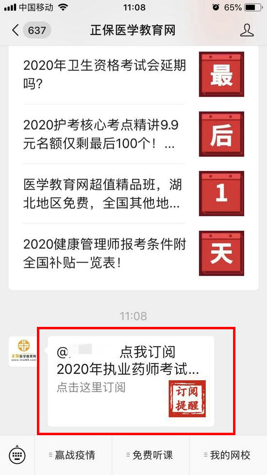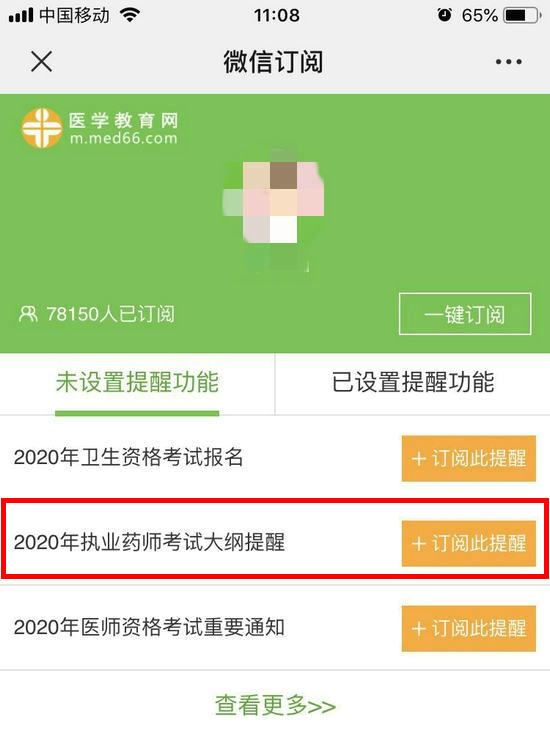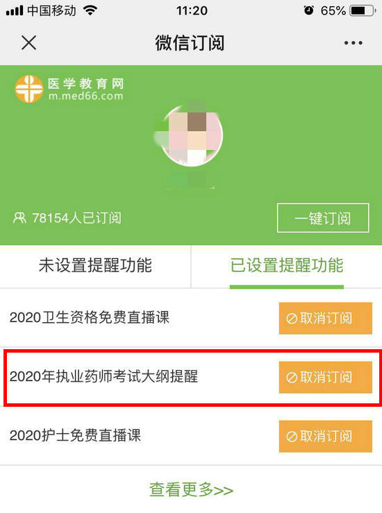 3. 找到「2020年執(zhí)業(yè)藥師考試大綱提醒」,點(diǎn)擊「訂閱此提醒」