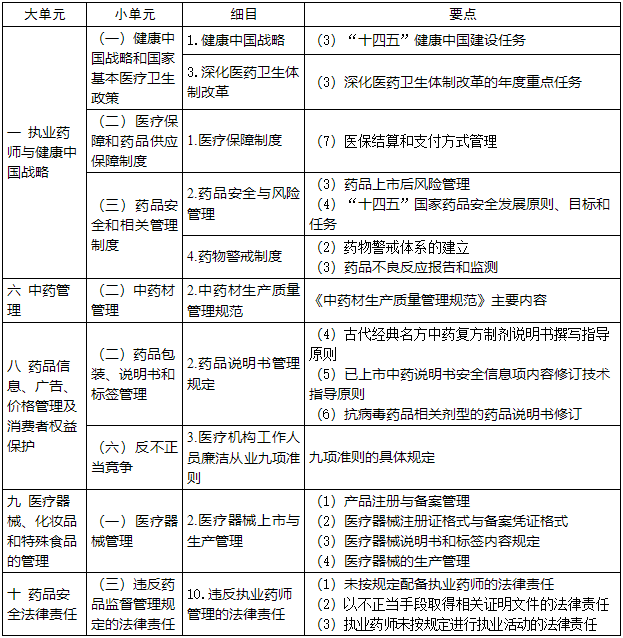 (五)在第十大單元中,第三小單元第十細(xì)目新增“未按規(guī)定配備執(zhí)業(yè)藥師的法律責(zé)任”“以不正當(dāng)手段取得相關(guān)證明文件的法律責(zé)任”“執(zhí)業(yè)藥師未按規(guī)定進(jìn)行執(zhí)業(yè)活動(dòng)的法律責(zé)任”要點(diǎn)。