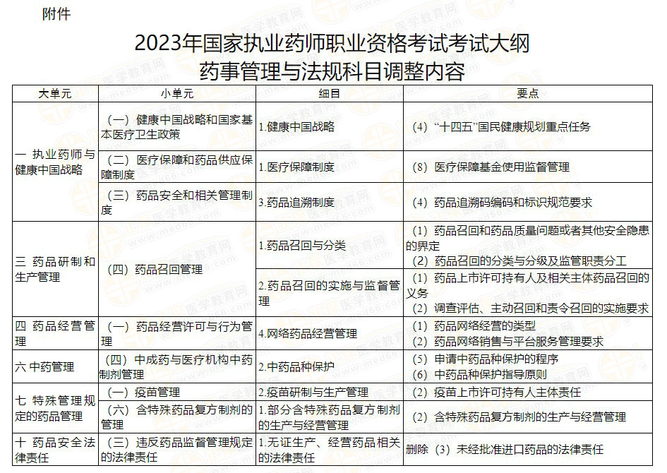 為做好2023年國(guó)家執(zhí)業(yè)藥師職業(yè)資格考試工作,受國(guó)家藥品監(jiān)督管理局委托,根據(jù)《國(guó)家執(zhí)業(yè)藥師職業(yè)資格考試考試大綱(第八版)》(以下簡(jiǎn)稱《大綱》)相關(guān)規(guī)定,確定2023年執(zhí)業(yè)藥師職業(yè)資格考試藥事管理與法規(guī)科目考試大綱部分內(nèi)容調(diào)整事宜。現(xiàn)通告如下: