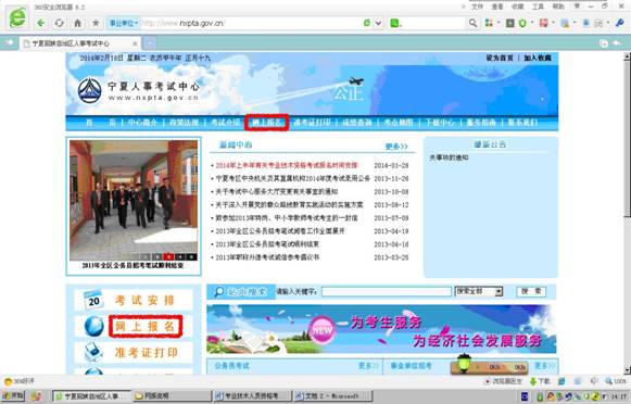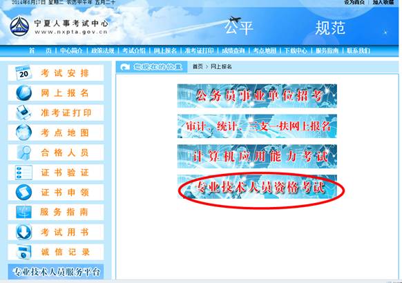 報(bào)考人員進(jìn)行2014年下半年專業(yè)技術(shù)人員資格考試網(wǎng)上報(bào)名時(shí),須登錄寧夏人事考試網(wǎng),登錄后點(diǎn)擊首頁“網(wǎng)上報(bào)名”