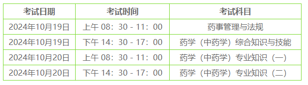 根據(jù)官方發(fā)布的通知,2024年執(zhí)業(yè)藥師考試定于10月19日、20日兩天進(jìn)行。具體科目安排如下: