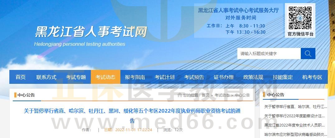 黑龍江人事考試網(wǎng)發(fā)布了《關(guān)于暫停舉行省直、哈爾濱、牡丹江、黑河、綏化等五個(gè)考區(qū)2022年度執(zhí)業(yè)藥師職業(yè)資格考試的通告》,具體通知內(nèi)容如下: