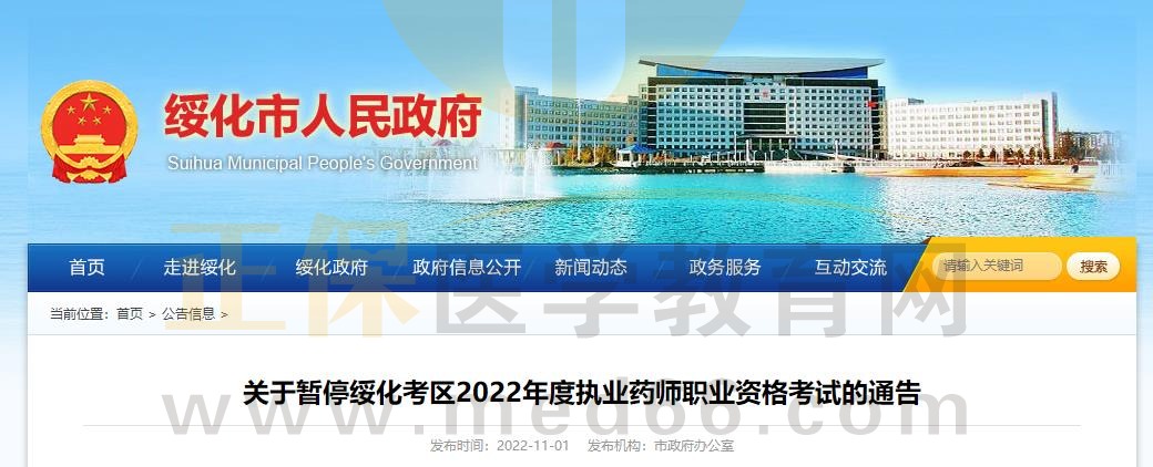 黑龍江綏化人民政府發(fā)布了《關(guān)于暫停黑龍江綏化考區(qū)2022年度執(zhí)業(yè)藥師職業(yè)資格考試的通告》,具體通知內(nèi)容如下: