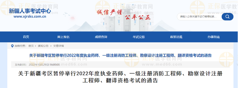 關(guān)于新疆考區(qū)暫停舉行2022年度執(zhí)業(yè)藥師考試的通告