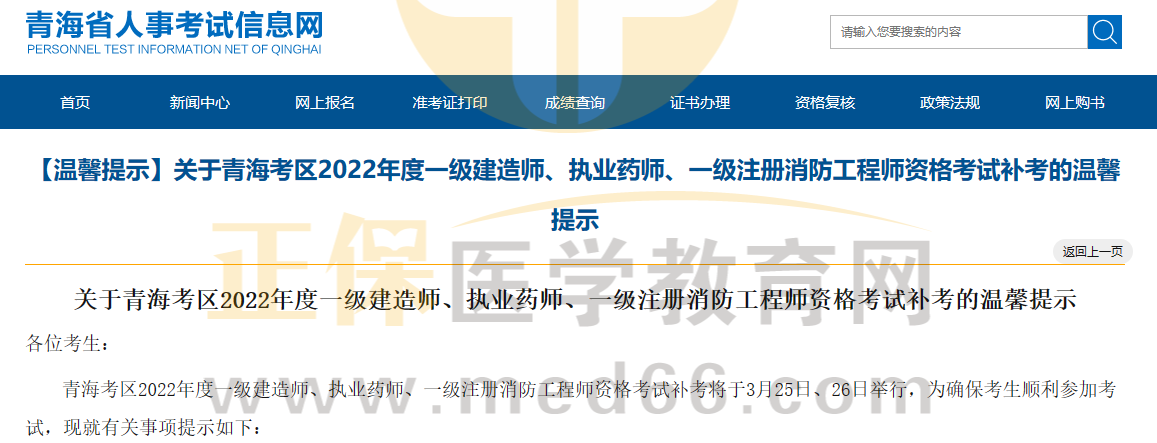 以上就是有關于“【溫馨提示】關于青??紖^(qū)2022年度一級建造師、執(zhí)業(yè)藥師、一級注冊消防工程師資格考試補考的溫馨提示”的相關內容,希望對各位考生有幫助,更多相關內容請關注醫(yī)學教育網(wǎng)!