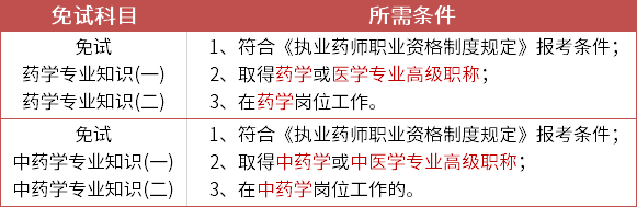 符合《執(zhí)業(yè)藥師職業(yè)資格制度規(guī)定》報考條件,按照國家有關(guān)規(guī)定取得藥學(xué)或醫(yī)學(xué)專業(yè)高級職稱并在藥學(xué)崗位工作的,可免試藥學(xué)專業(yè)知識(一)、藥學(xué)專業(yè)知識(二),只參加藥事管理與法規(guī)、藥學(xué)綜合知識與技能兩個科目的考試;取得中藥學(xué)或中醫(yī)學(xué)專業(yè)高級職稱并在中藥學(xué)崗位工作的,可免試中藥學(xué)專業(yè)知識(一)、中藥學(xué)專業(yè)知識(二),只參加藥事管理與法規(guī)、中藥學(xué)綜合知識與技能兩個科目的考試。