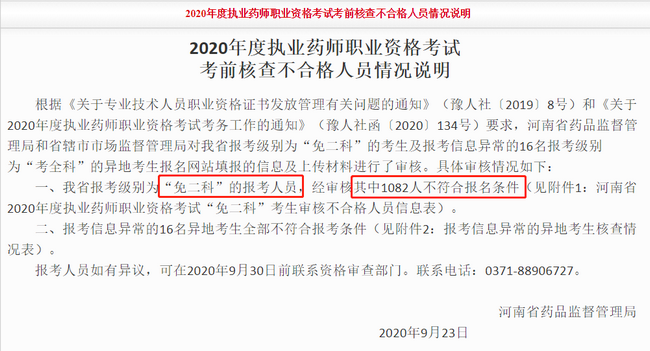 2020年執(zhí)業(yè)藥師報考結(jié)束后,9月下旬河南省通報了1082名考生因報考“免二科”而考前核查不合格,通報原因是學(xué)歷、職稱證書、聘書造假或不符合。