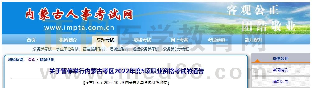 關(guān)于暫停舉行內(nèi)蒙古考區(qū)2022年度5項(xiàng)職業(yè)資格考試的通告
