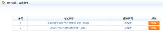 此時(shí)出現(xiàn)選擇報(bào)考列表。點(diǎn)擊欲報(bào)考的考試右側(cè)的【選擇】按鈕,如圖