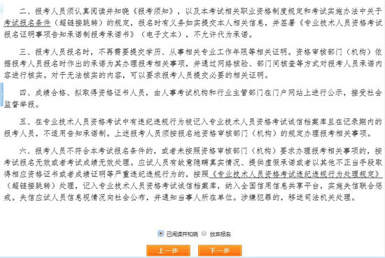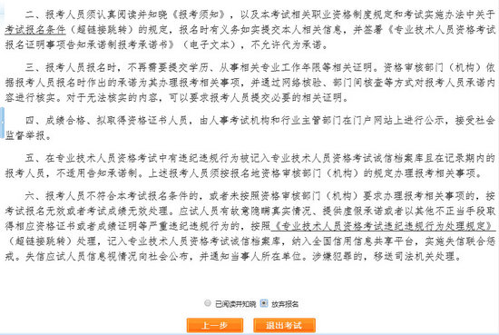 選擇報(bào)名省份,點(diǎn)擊【下一步】,顯示【專業(yè)技術(shù)人員資格考試報(bào)名證明事項(xiàng)告知承諾制告知書】,如圖。閱讀完畢后,選中【我已閱知并同意】,點(diǎn)擊【下一步】,可進(jìn)入報(bào)考須知。若考生不想報(bào)名,點(diǎn)擊【放棄報(bào)名】,退出該考試報(bào)名。