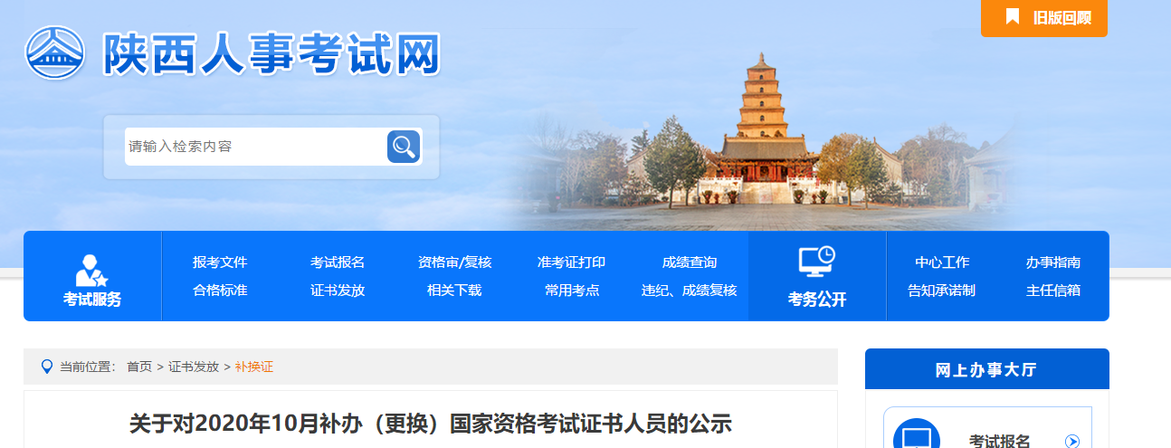 2020年10月需要補辦(更換)的證書資料公示期滿后送人社部人事考試中心,待補辦證書發(fā)放至我省后,我們將及時組織發(fā)放,請關(guān)注陜西省人事考試中心官網(wǎng)或公眾微信號sxrskswx,及時獲取辦證資訊。
