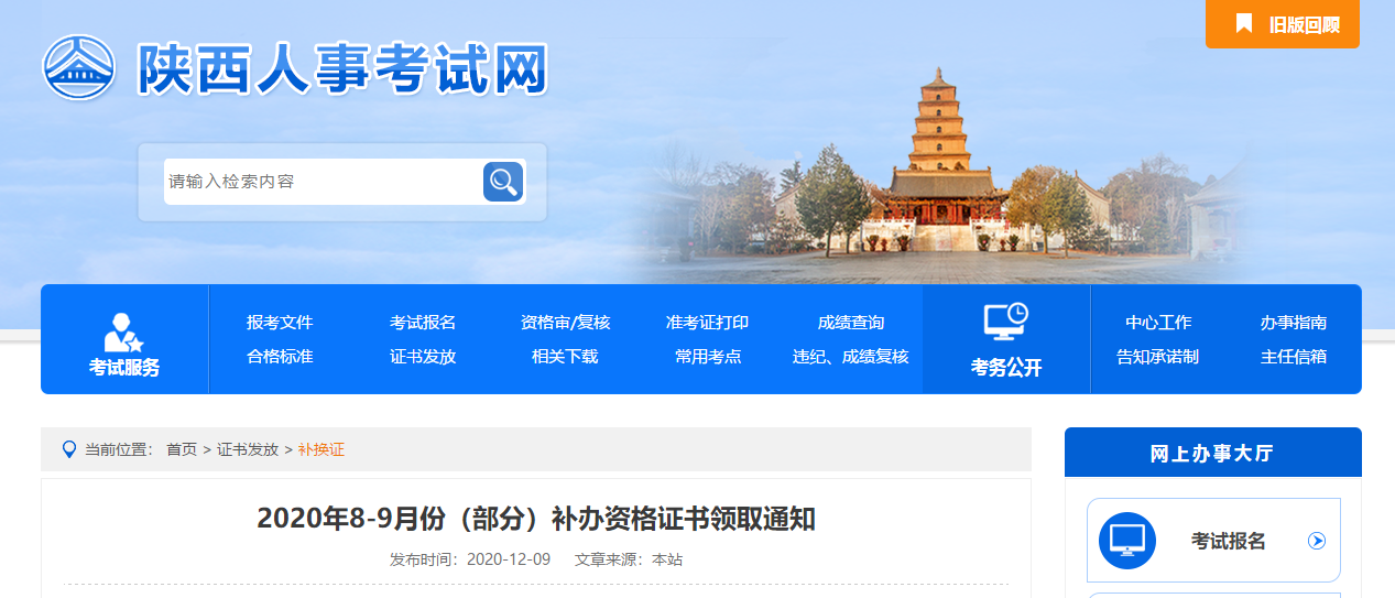陜西人事考試中心發(fā)布了《2020年8-9月份(部分)補辦資格證書領取通知》的通知,醫(yī)學教育網(wǎng)為大家大家了解,為大家整理如下: