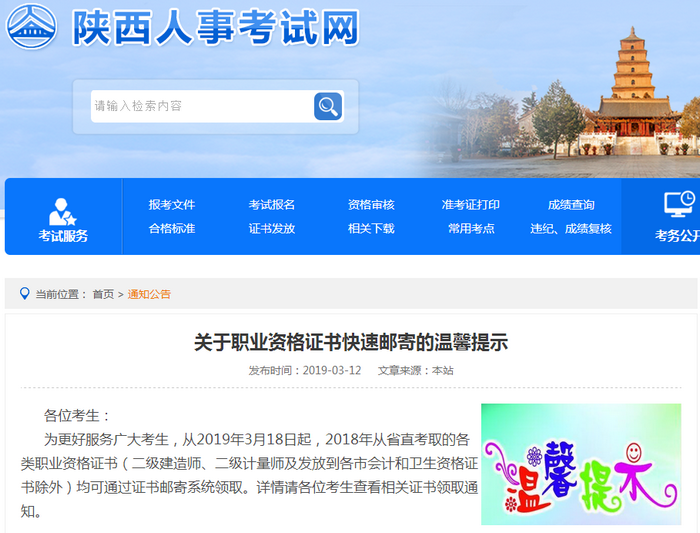 2019年3月12日陜西省人事考試中心發(fā)布通知,執(zhí)業(yè)藥師考試證書從2019年3月18日開始領取,具體通知如下,2018年陜西省直達考生請注意!