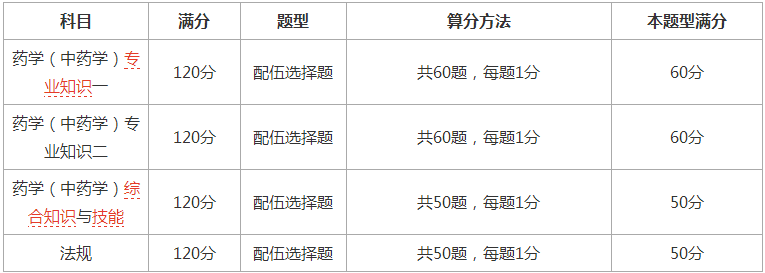 執(zhí)業(yè)藥師考試各科目試卷題量均為120題,單獨計分,每題均為1分,滿分為120分。藥事管理與法規(guī)科目每道題的備選項為四個,其他科目每道題的備選項為五個。各科目配伍選擇題評分標準如下:
