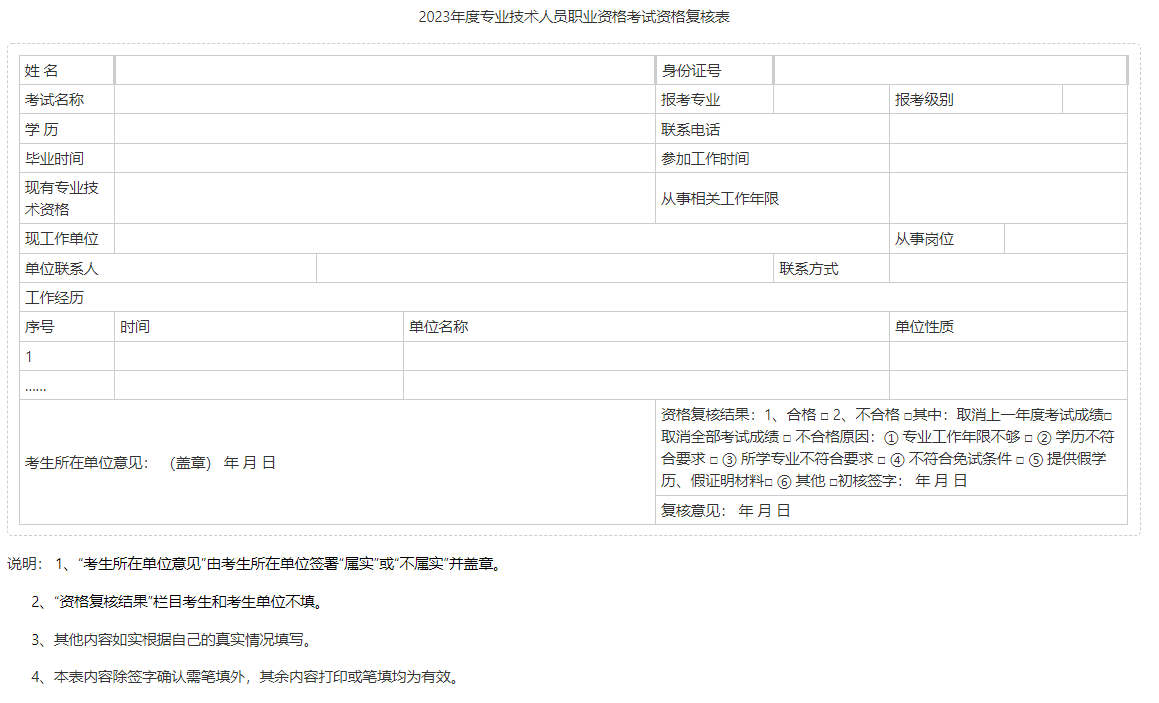 (4)《2023年度專業(yè)技術人員職業(yè)資格考試資格復核表》(須單位蓋章)。此表詳見附件3。