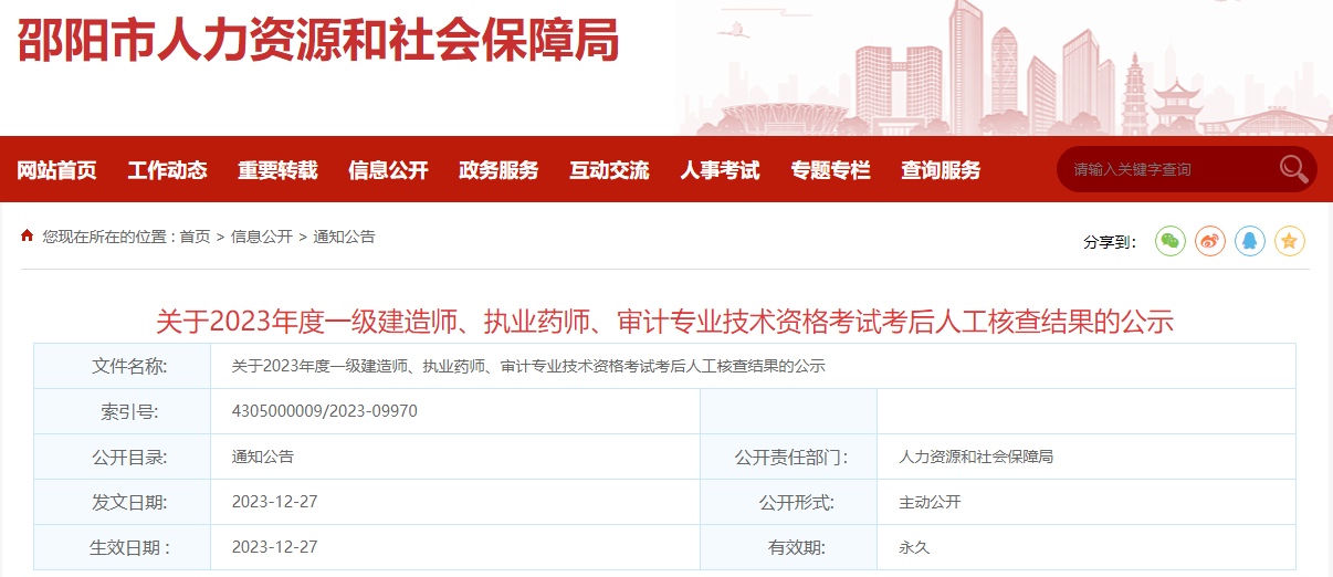 【湖南邵陽】關于2023年度執(zhí)業(yè)藥師、一級建造師、審計專業(yè)技術資格考試考后人工核查結果的公示