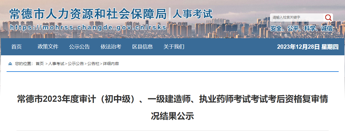 【湖南常德】2023年審計(初中級)、一級建造師、執(zhí)業(yè)藥師考試考后資格復(fù)審情況結(jié)果公示
