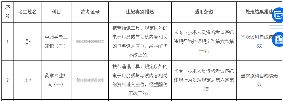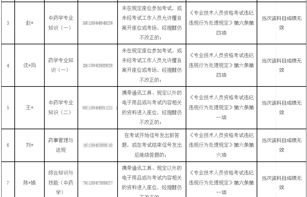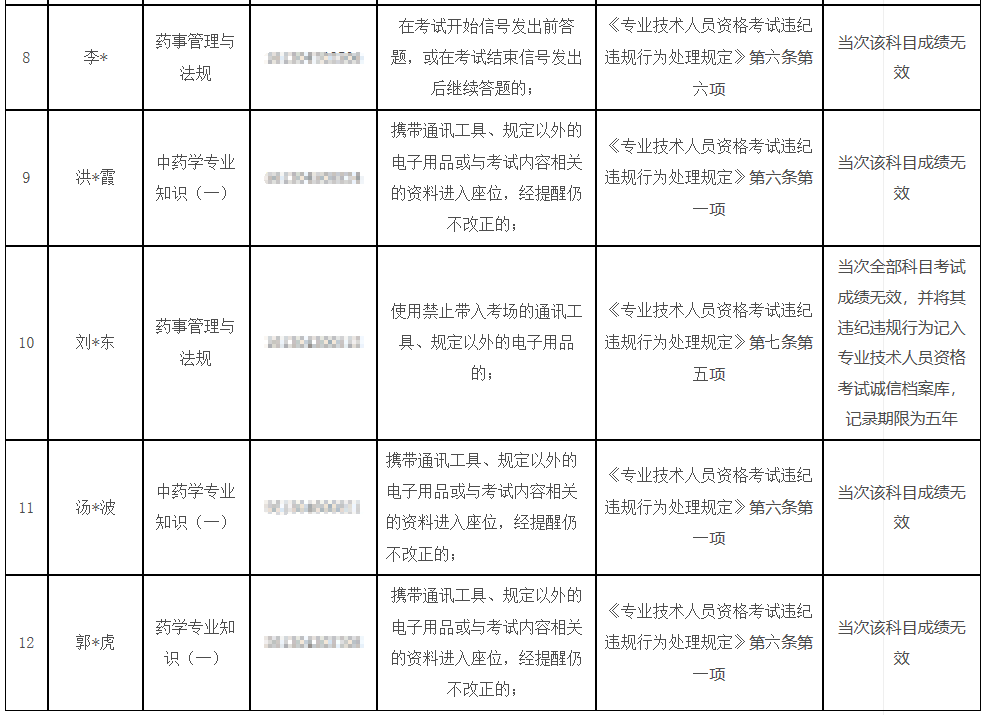 根據(jù)人力資源和社會保障部《專業(yè)技術(shù)人員資格考試違紀(jì)違規(guī)行為處理規(guī)定》(人社部令第31號),陜西省人事考試中心經(jīng)核實(shí)有關(guān)應(yīng)試人員違紀(jì)違規(guī)行為事實(shí)后研究決定,擬對參加2023年度執(zhí)業(yè)藥師職業(yè)資格考試陜西考區(qū)有違紀(jì)違規(guī)行為的應(yīng)試人員作相應(yīng)處理。此公告涉及的違紀(jì)違規(guī)應(yīng)試人員,自公告發(fā)布之日起5個工作日內(nèi),可根據(jù)有關(guān)規(guī)定向省人事考試中心書面提交復(fù)核申請,逾期不再受理。現(xiàn)將有關(guān)情況公告如下: