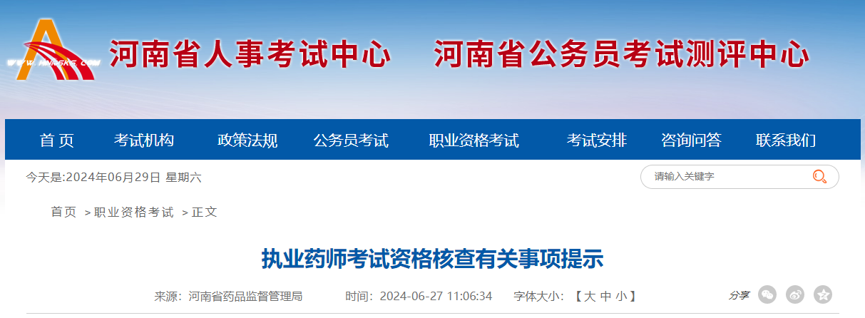 【河南】2024年執(zhí)業(yè)藥師考試資格核查有關(guān)事項(xiàng)提示