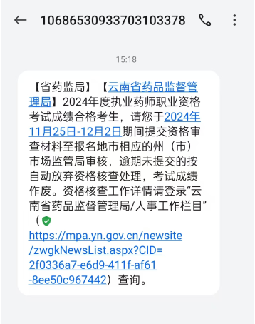 執(zhí)業(yè)藥師考試成績公布后,有學(xué)員反饋收到云南藥監(jiān)局發(fā)布的考后審核通知的短信,具體內(nèi)容如下:
