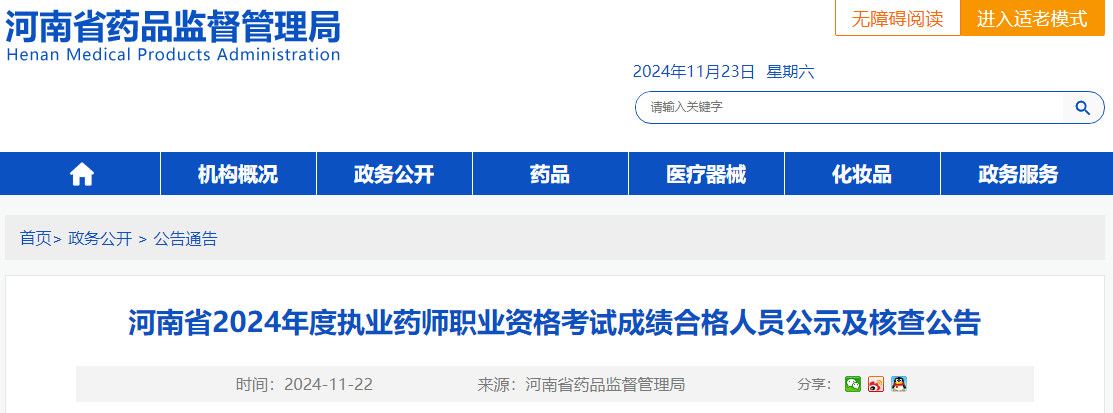 【河南】2024年執(zhí)業(yè)藥師考試成績合格人員公示及核查公告