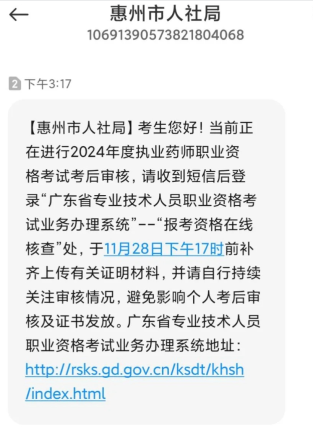 【廣東惠州】2024年執(zhí)業(yè)藥師考后審核短信通知!