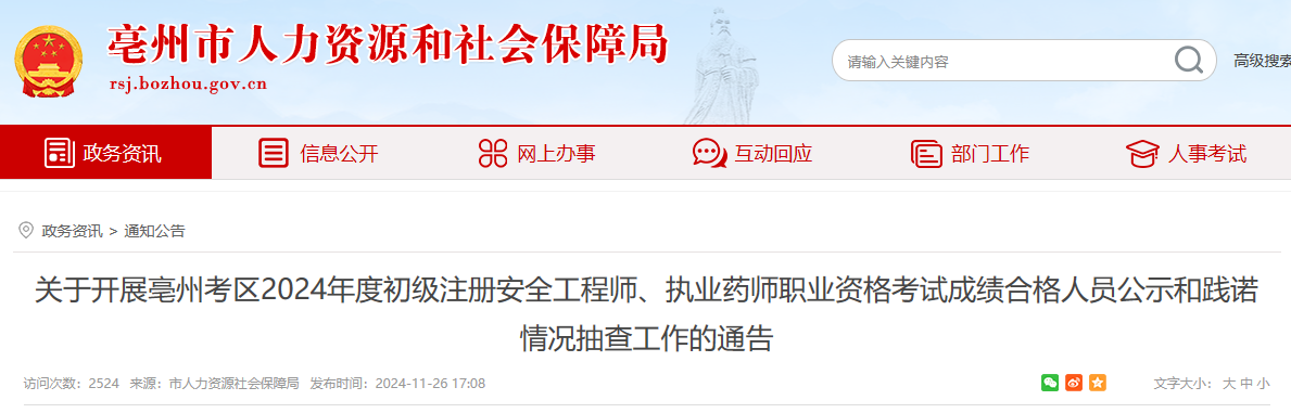 【安徽亳州】2024年執(zhí)業(yè)藥師考試成績合格人員公示和抽查工作通知