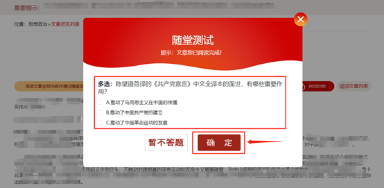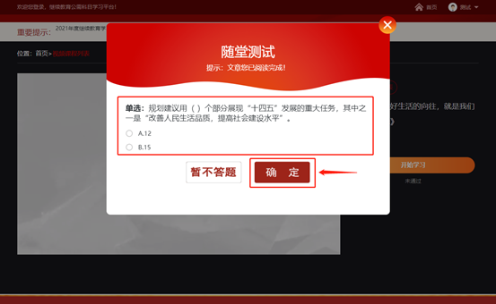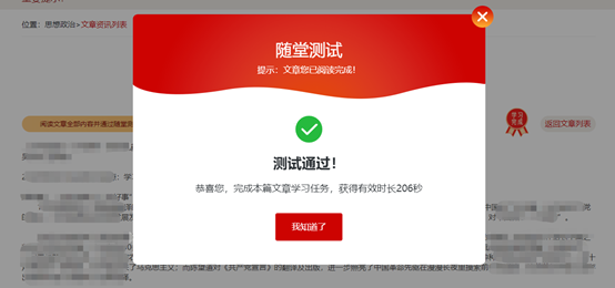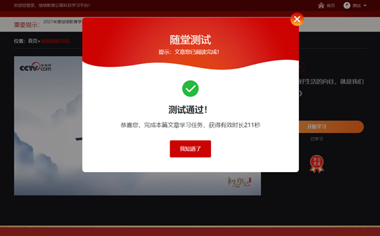 觀看每篇文章內(nèi)容后,彈出隨堂測試,考試通過后獲得有效時(shí)長。