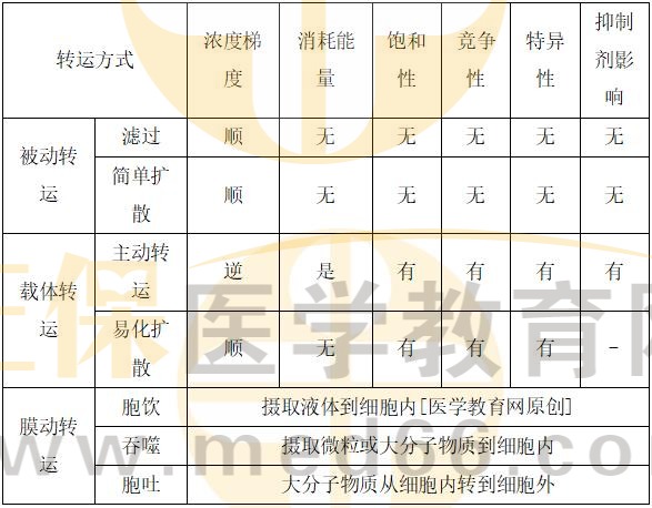 【解析】被動轉(zhuǎn)運是物質(zhì)從高濃度區(qū)域向低濃度區(qū)域的轉(zhuǎn)運。轉(zhuǎn)運速度與膜兩側(cè)的濃度差成正比,轉(zhuǎn)運過程不需要載體,不消耗能量。[醫(yī)學(xué)教育網(wǎng)原創(chuàng)]膜對通過的物質(zhì)無特殊選擇性,不受共存的其他物質(zhì)的影響,即無飽和現(xiàn)象和競爭抑制現(xiàn)象,一般也無部位特異性。藥物大多數(shù)以這種方式通過生物膜。被動轉(zhuǎn)運包括濾過和簡單擴散。藥物的跨膜轉(zhuǎn)運方式可以按照以下表格進(jìn)行記憶:
