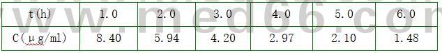 給某患者靜脈注射一單室模型藥物,劑量為100.0mg,測得不同時刻血藥濃度數(shù)據(jù)如下表。初始血藥濃度為11.88μg/ml。