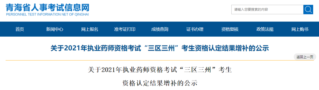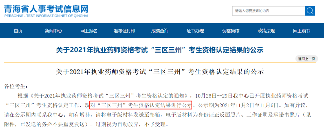 11月2日,青海省人事考試信息網(wǎng)發(fā)布了關(guān)于2021年執(zhí)業(yè)藥師資格考試“三區(qū)三州”考生資格認(rèn)定結(jié)果的公示,認(rèn)定了72名考生為“三區(qū)三州”考生資格。