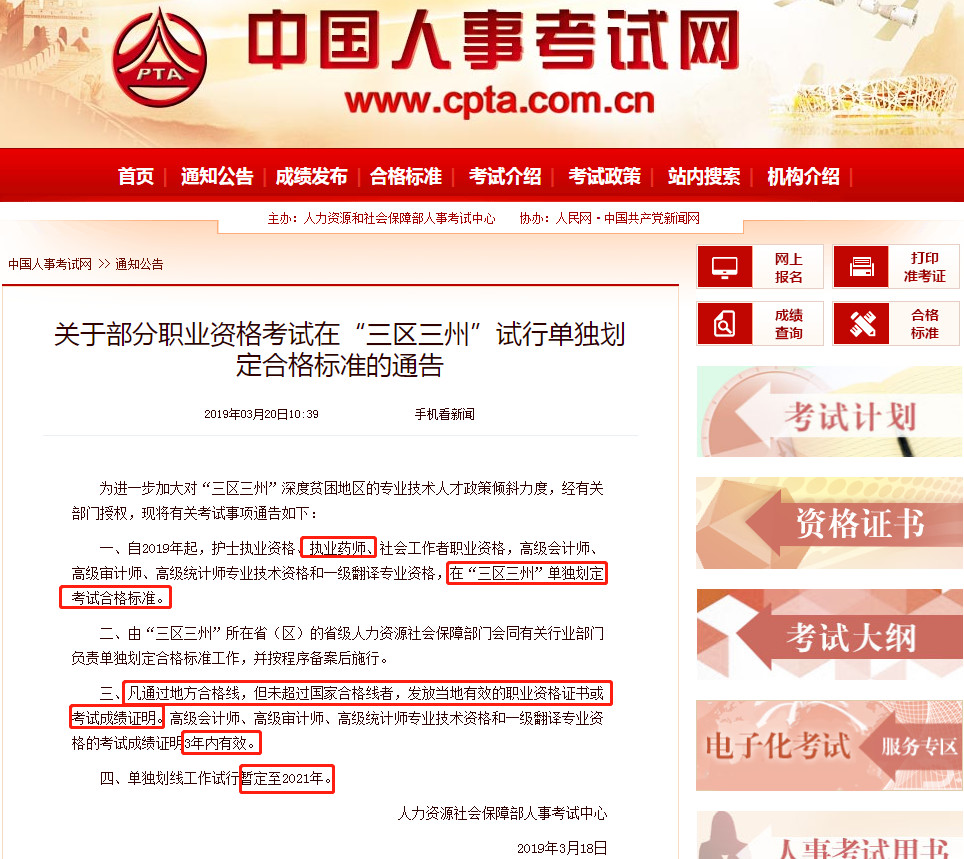 根據(jù)中國人事考試網(wǎng)官方公告,自2019年起,執(zhí)業(yè)藥師以及其他專業(yè)技術(shù)人才將單獨(dú)劃定考試合格標(biāo)準(zhǔn),單獨(dú)劃線工作試行暫定至2021年。