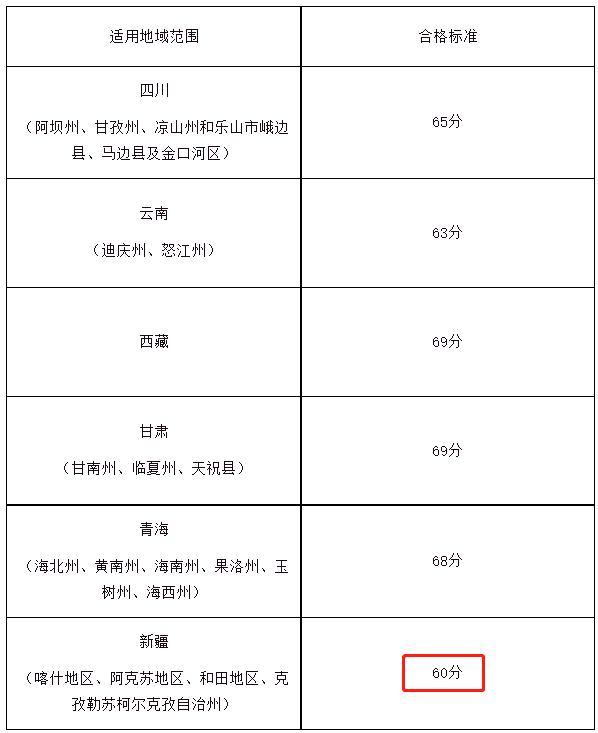 2019年,四川、云南、青海、新疆、甘肅和西藏的部分地區(qū)考生單獨(dú)劃分合格標(biāo)準(zhǔn),最低及格線降至59分!